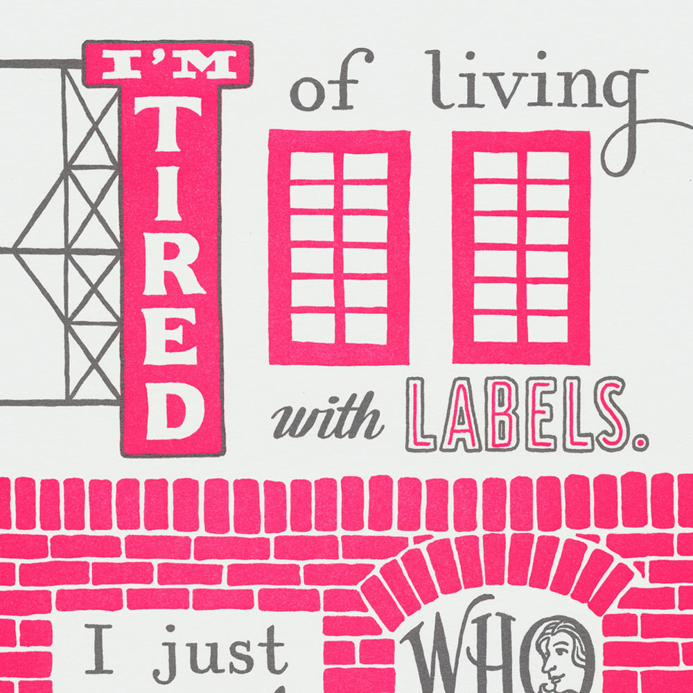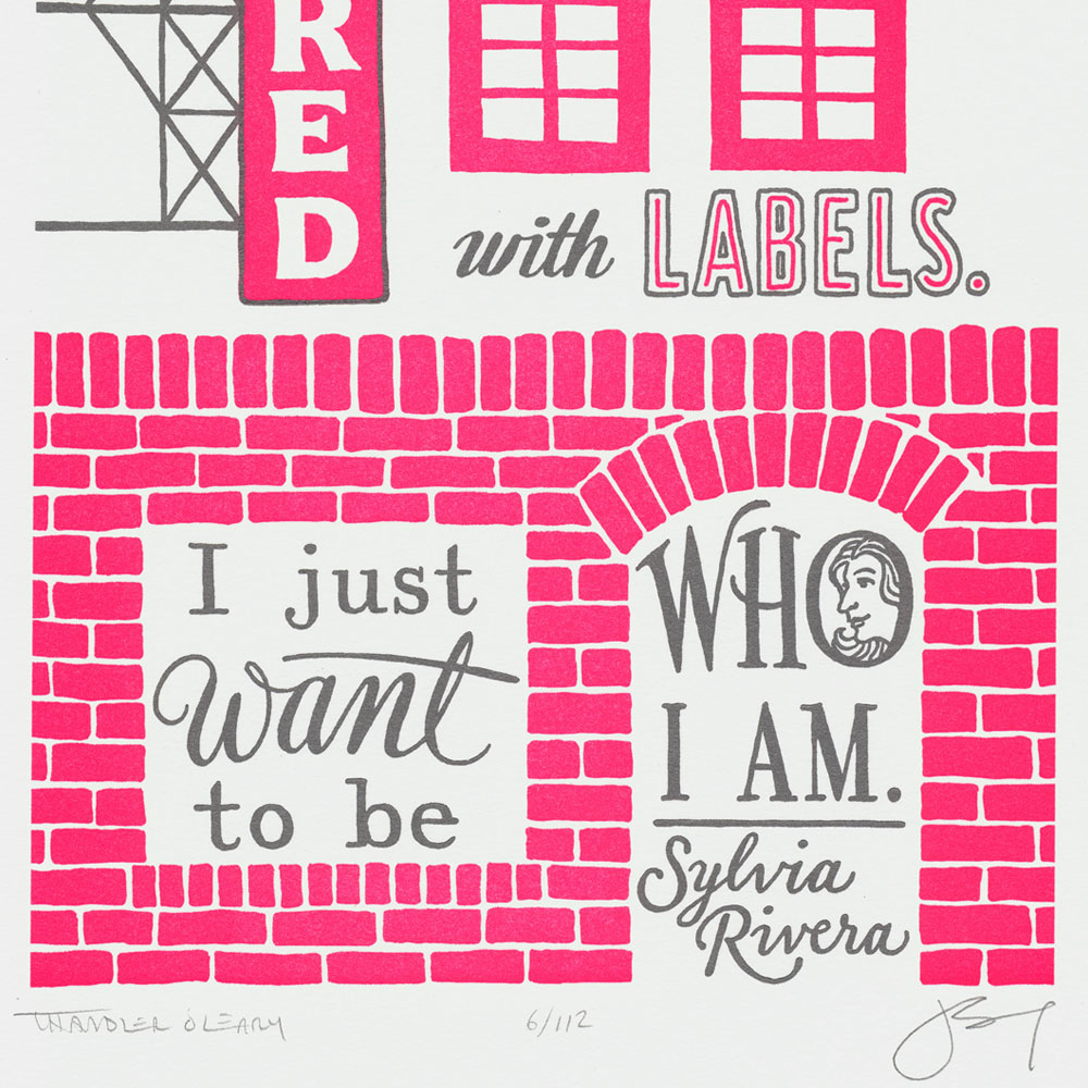 This is an “unofficial” member of the Dead Feminists broadsides series, an original letterpress print created in conjunction with our 2018 retrospective exhibition, Words of Action, held at PCAF (Pierce County AIDS Foundation) in Tacoma, Washington. Ms. Labeled features transgender activist and self-identified drag queen Sylvia Rivera. Ms. Rivera was an instrumental and vocal figure in the rise and continuation of the LGBTQ movement, advocating for equality and civil rights for people of all genders and sexual orientations. The print is letterpress printed in hot pink and metallic silver inks, with a design inspired by the façade of the Stonewall Inn in New York City.
