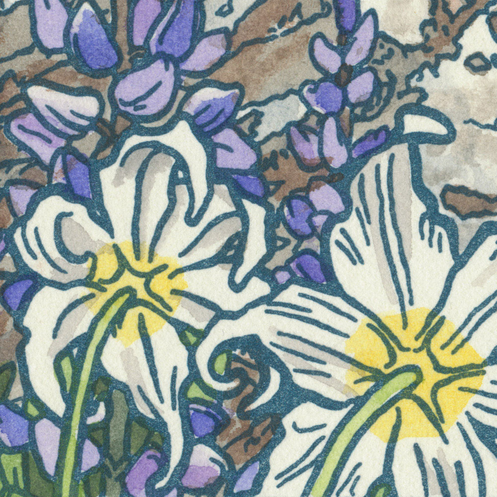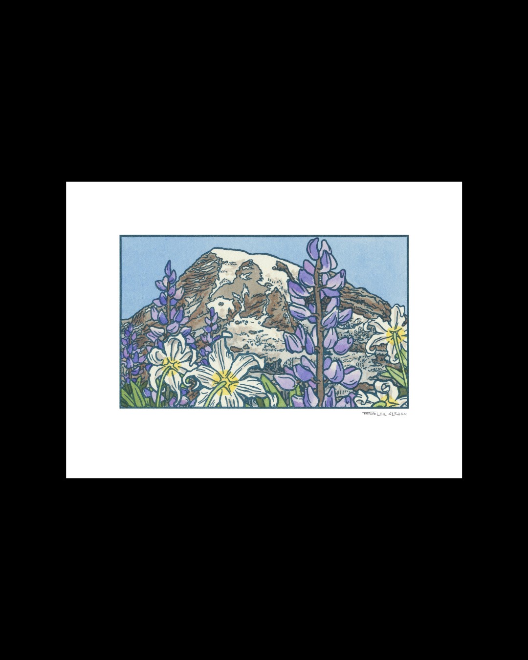 The print depicts an alpine meadow in full bloom. The view here is unusual—the viewer’s eye is at ground level, creating an illusion of scale. Snow-white avalanche lilies sway in the breeze, their delicate petals curling under themselves. Brilliant purple, wild lupines stand straight and tall as they hint at the thousands of others stretching to the horizon. And the craggy south face of Mt. Rainier towers in the background, its receding glaciers signaling the heat of high summer.