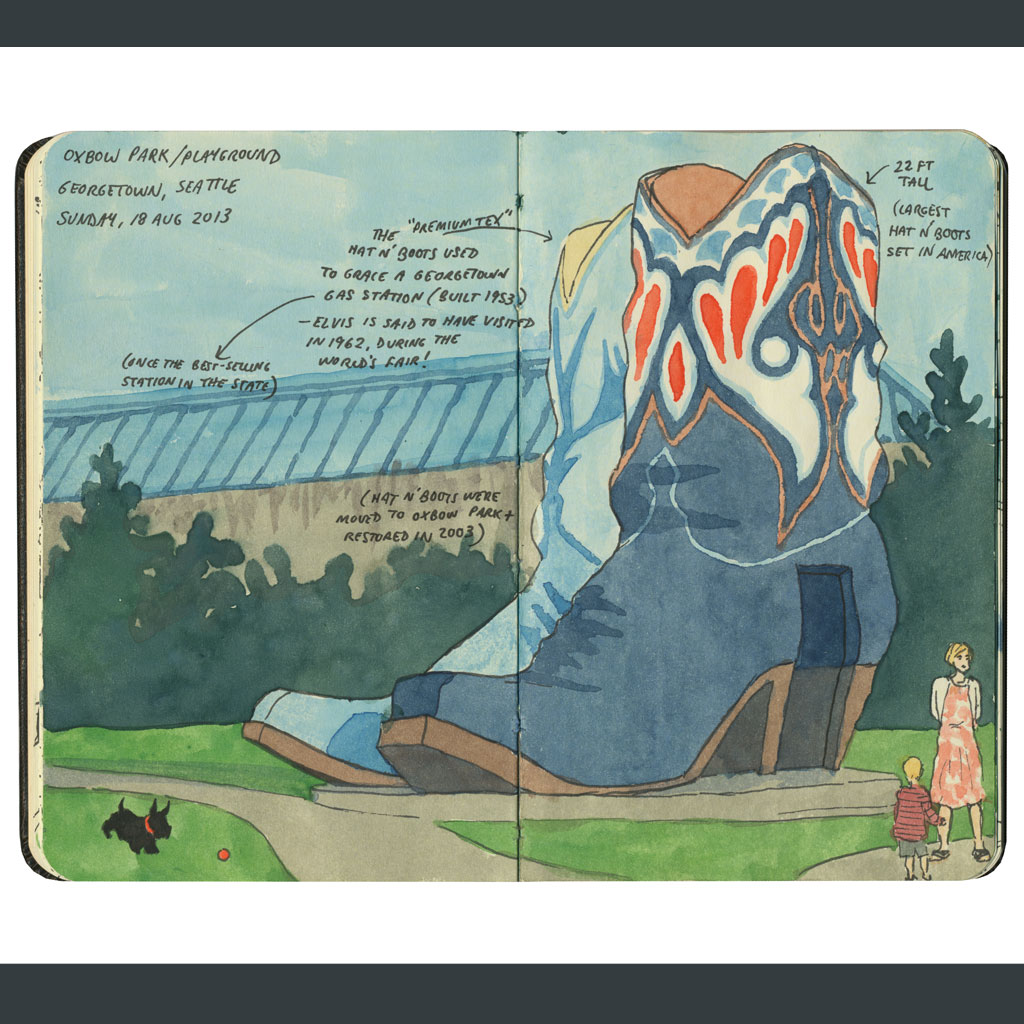 An archival giclee reproduction print of a sketchbook drawing from my Drawn the Road Again blog. This drawing depicts Seattle’s giant cowboy boots—formerly a roadside attraction on old Highway 99, now part of Oxbow Park. (The corresponding blog post is here.)